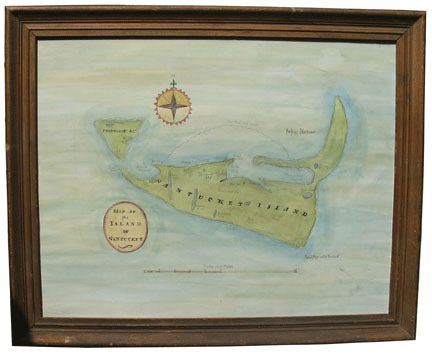 A large scale watercolor map of the islands of Nantucket and Tuckanuck in Massachusetts. Based upon an 18th century map. Price and other information available upon request.
