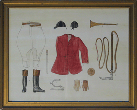 EQUESTRIAN GEAR PAINTING The original of this painting of Paul Mellon's equestrian gear is housed in the Metropolitan Museum of Art in New York -- this watercolor is painted after this piece. Framed in an early 20th century frame in gold. |
