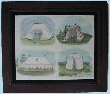 FOUR VICTORIAN TENTS A large watercolor based upon borrowed images from an English archive of Victorian tents. In a dark wood frame, incised with intricate border motifs. Price and other information available upon request. |