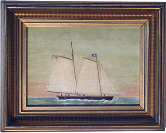 An unusual green and pink sky and a turquoise ocean distinguish this small watercolor of a sailboat. In a 19th century lemon gilt frame.
